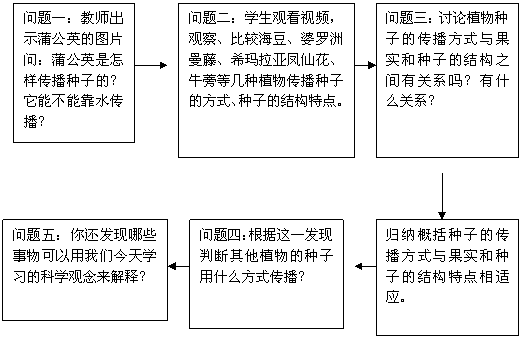 在学生观察、比较了蒲公英和海豆等一些果实和种子的结构特点后,学生会对不同的植物种子的传播方式与果实和种子的结构之间的关系有所意识,当教师提出这个问题后,通过讨论和彼此的交流,学生会比较清晰地发现种子的传播方式是和种子的结构特点相适应的。